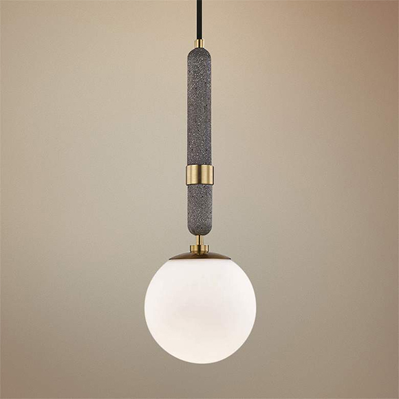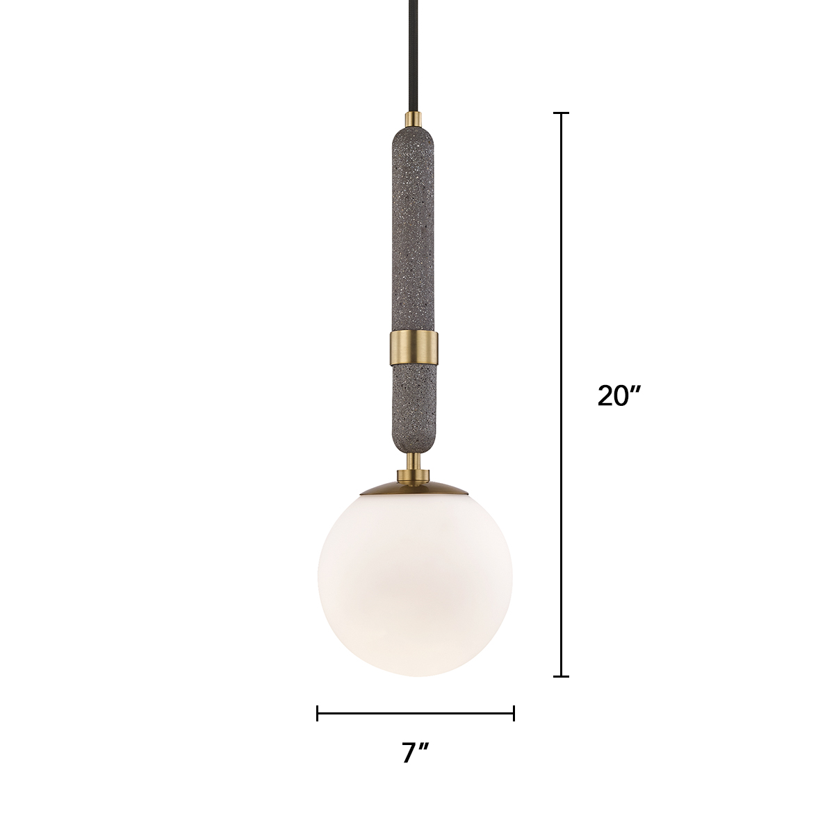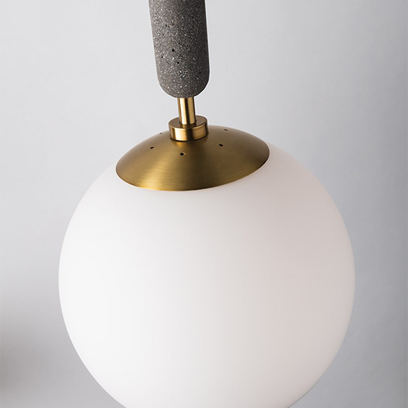 Brielle est une petite suspension mariant différentes textures: béton hétérogène, verre givré mat et métal brossé. Les matériaux introduisent une intrigue texturale instantanée dans un espace. Les nuances blanches classiques et les accents métalliques autour du corps cylindrique contrastent avec le béton et lui confèrent une sensation élégante et contemporaine.