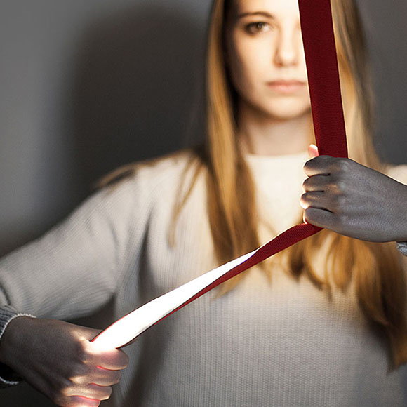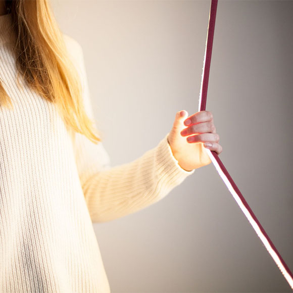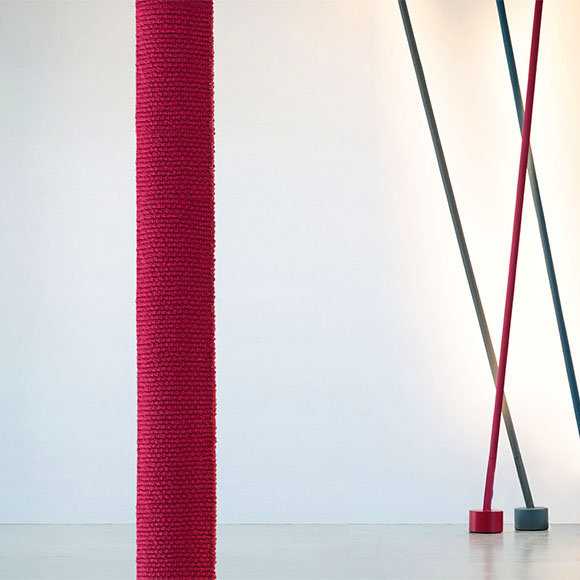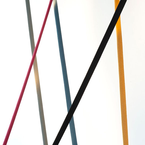 L’installation de cette lampe est simple, elle se fixe discrètement au plafond grâce à un support, et au sol avec une base ronde en métal peint de la même couleur que la bande de tissu élastique. La lampe Elastica s’allume et s’éteint simplement en la tirant, tandis que la variation de l’intensité lumineuse se fait en la déplaçant lentement vers le haut ou vers le bas. Ce concept d’interaction naturelle entre la lampe et l’utilisateur est au cœur de la création de la lampe Elastica par Innocenzo Rifino et Diego Rossi de Studio Habits.