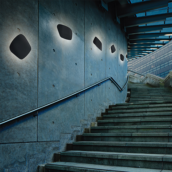 Conçu et fabriquée au Québec, Shell est une applique murale extérieure à la forme trapézoïdale et légèrement courbée qui laisse échapper une douce lumière donnant l’impression de flotter. Shell se présente aussi bien seule qu’en groupe et s’adapte aussi bien à un environnement extérieur qu’intérieur.