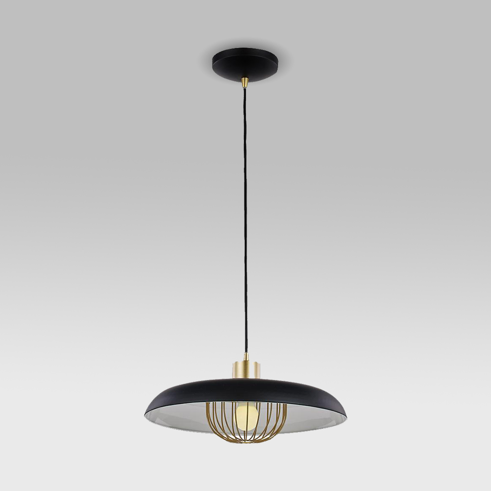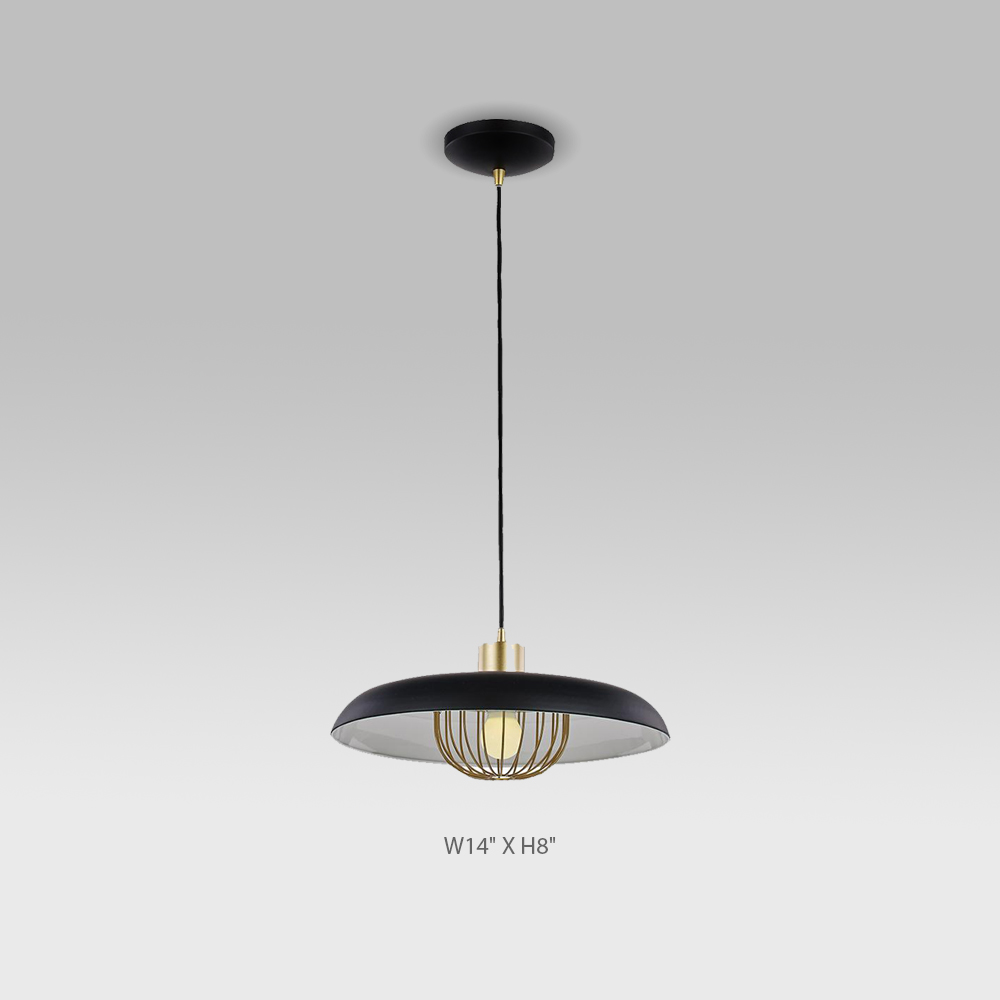 Verona est un luminaire suspendu en métal noir mat avec un abat-jour en dôme et une cage métallique au fini or qui recouvre l’ampoule.